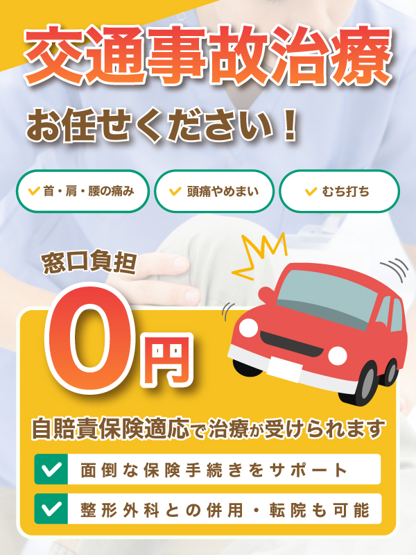 当院では交通事故治療も専門で行っており、自賠責保険を使い、患者様負担はありません。整形外科との併院も可能です。