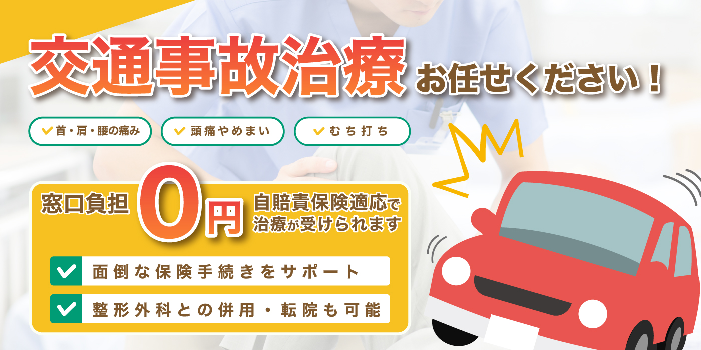 当院では交通事故治療も専門で行っており、自賠責保険を使い、患者様負担はありません。整形外科との併院も可能です。